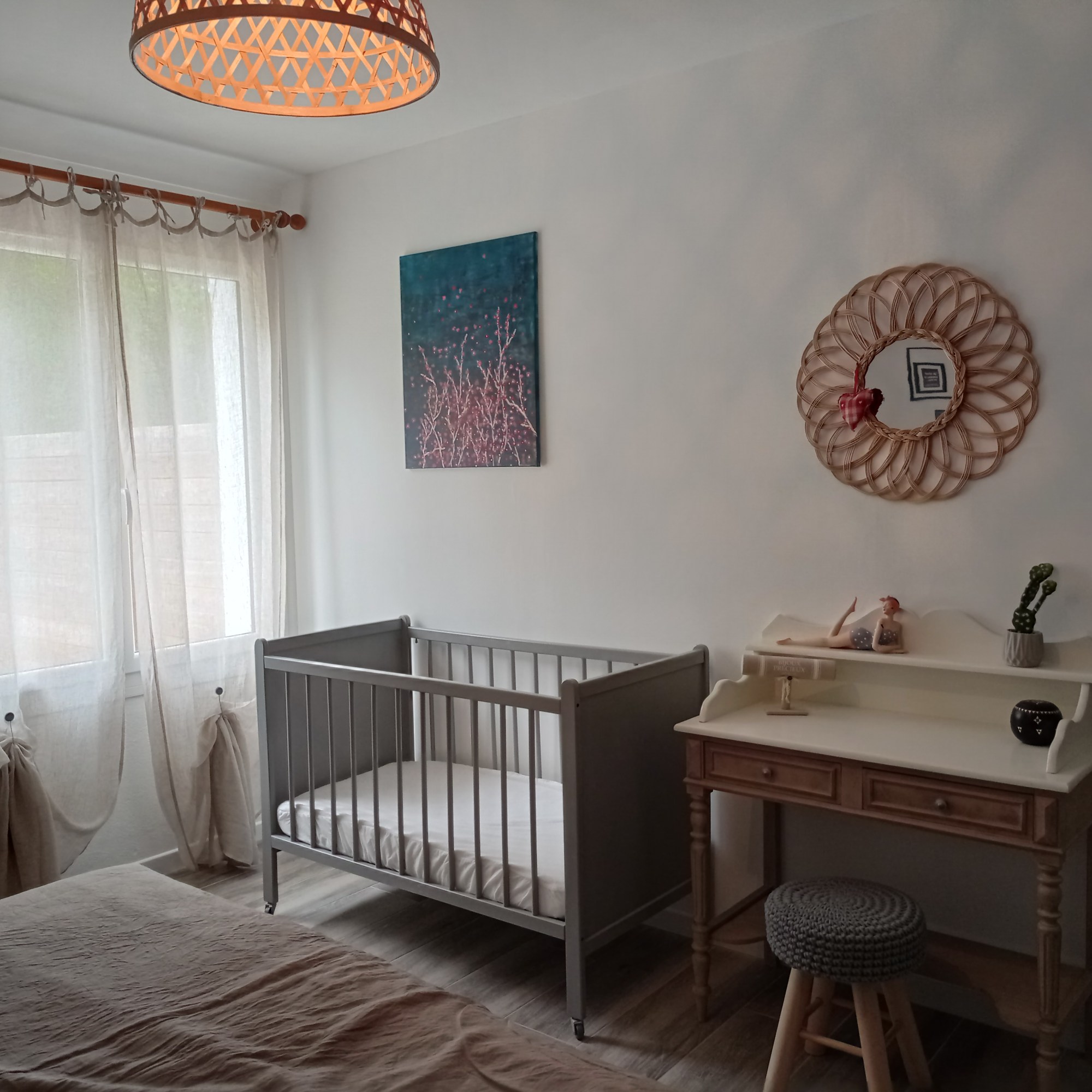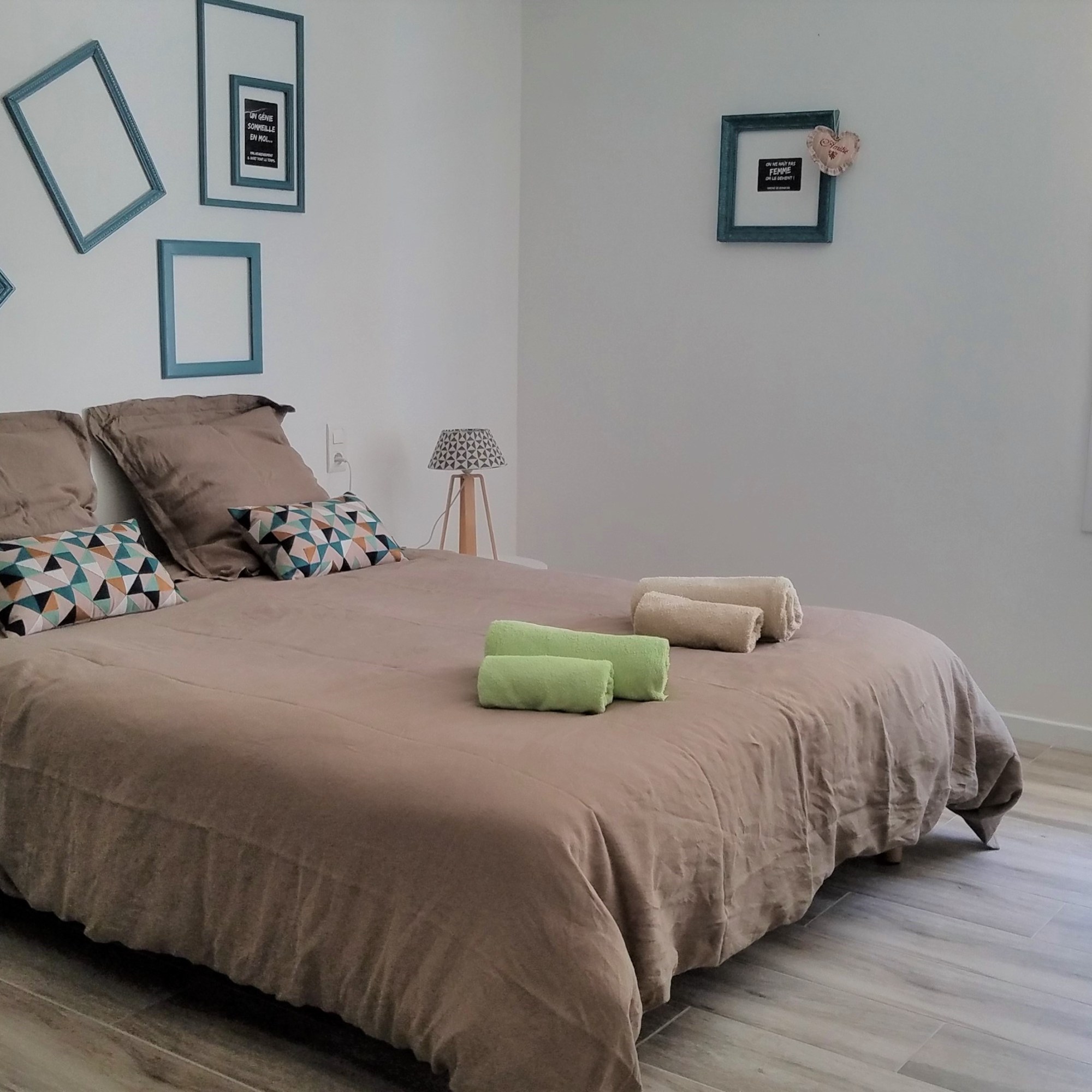 Chambre 1 : lit de 160, couette , 2 oreillers 65 x 65 et 2 oreillers 50 x 70, alèses de lits et d’oreillers fournies, fauteuil, coiffeuse, dressing, fer à repasser. Lit bébé.