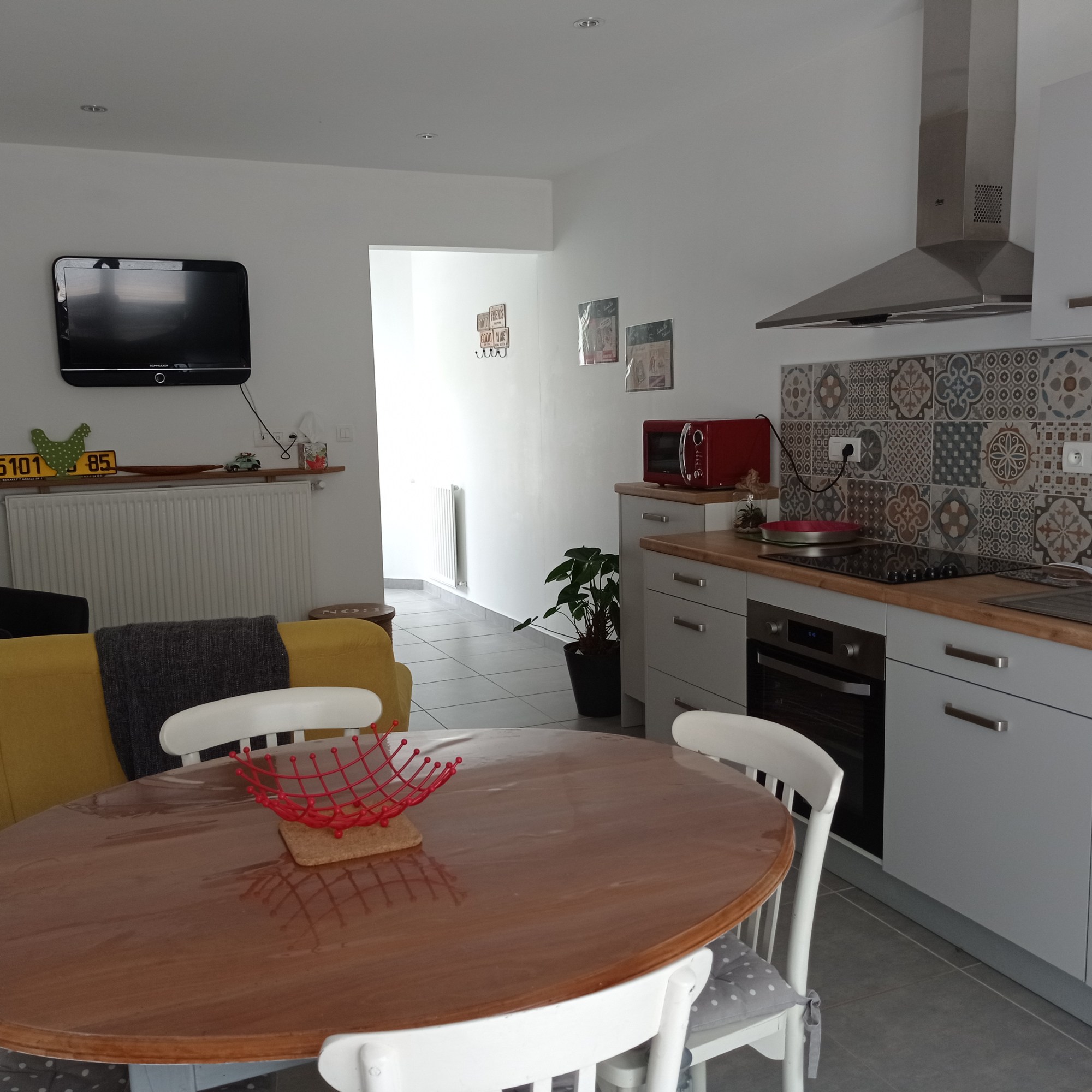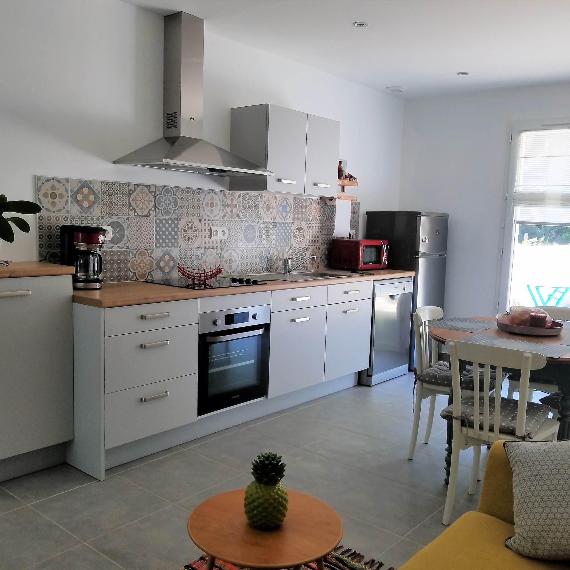 Cuisine équipée : plaque vitro, frigo-congélateur, four électrique, lave vaisselle, micro-ondes, cafetière à filtre, grille pain etc… Table ovale, 4 chaises.