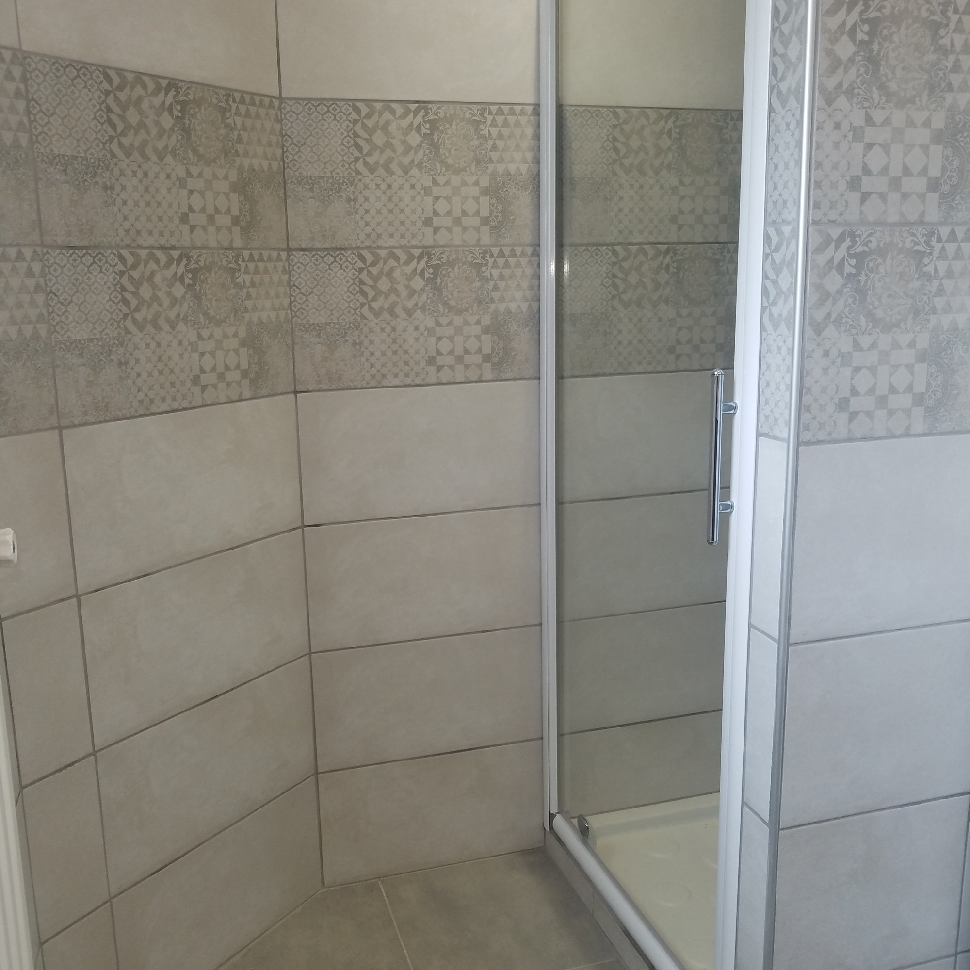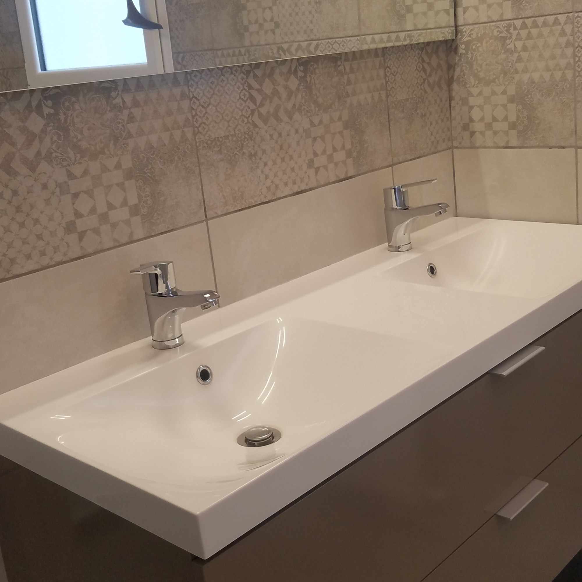 Salle d’eau : bac à douche avec tapis de bain fourni, meuble avec tiroirs deux vasques, miroir, sèche cheveux, machine à laver.